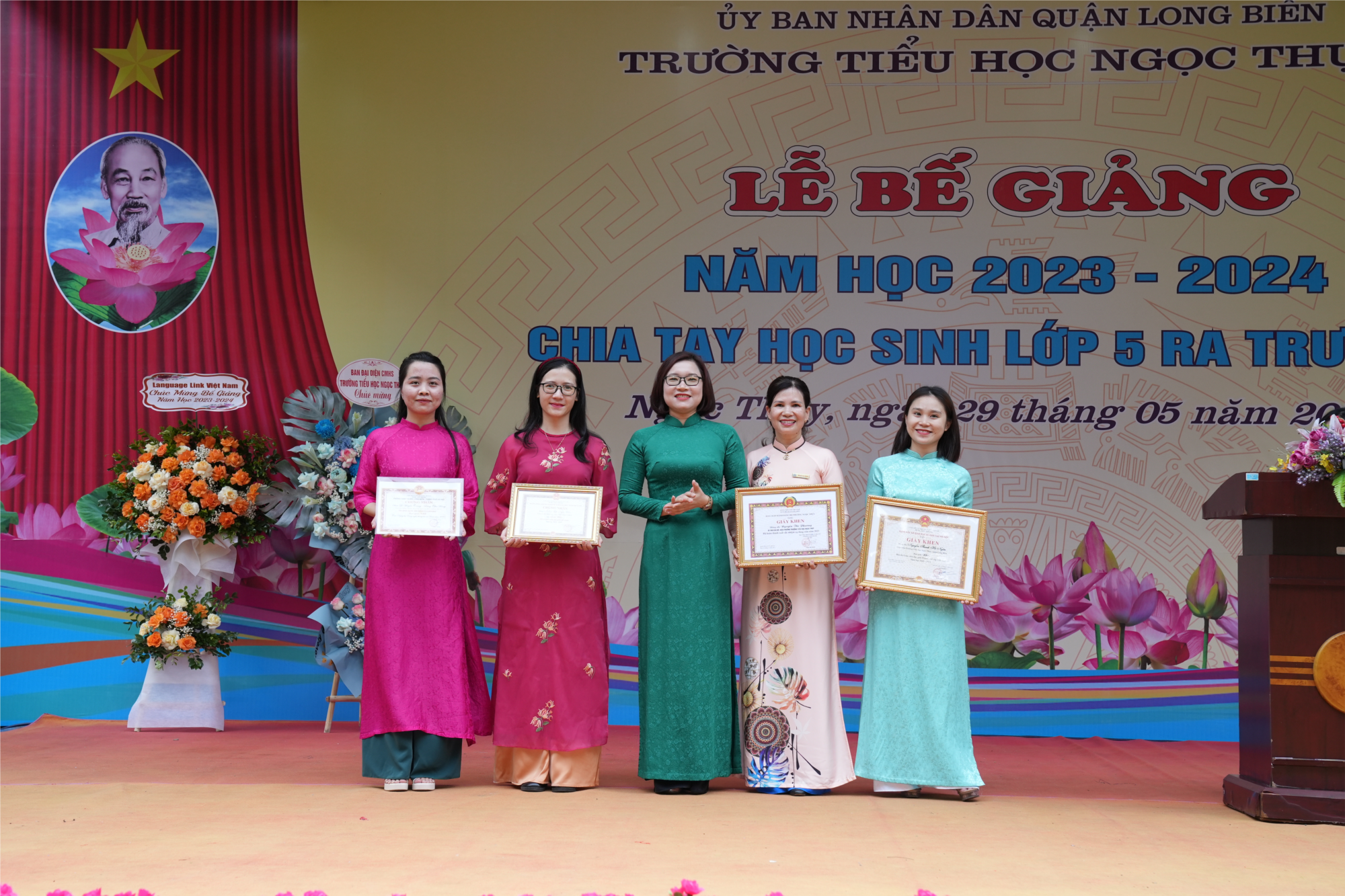 Thực hiện sự chỉ đạo của UBND quận Long Biên. Sáng này 29/5/2024, Trường Tiểu học Ngọc Thụy trang trọng tổ chức Lễ bế giảng năm học 2023 – 2024; chia tay học sinh lớp 5 niên khóa 2019 - 2024 ra trường và bàn giao học sinh về sinh hoạt hè tại địa phương.