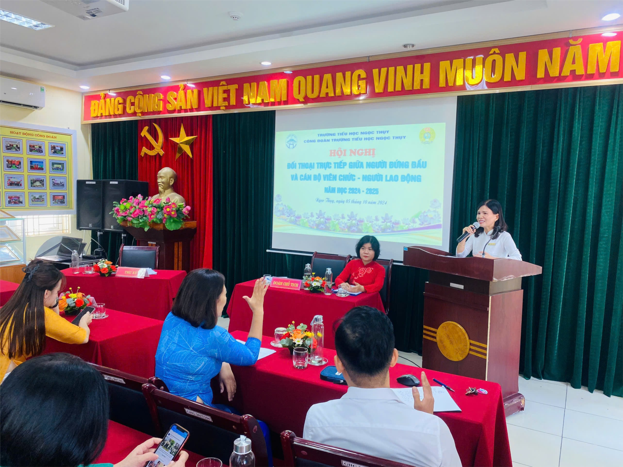 Thực hiện Kế hoạch công tác công đoàn năm học 2024–2025 và nhằm tăng cường dân chủ cơ sở, lắng nghe ý kiến đóng góp từ đội ngũ cán bộ, giáo viên, nhân viên trong nhà trường, sáng ngày 05/10/2024, Công đoàn trường Tiểu học Ngọc Thụy phối hợp với Nhà trường đã tổ chức “Hội nghị đối thoại giữa người đứng đầu đơn vị với cán bộ, viên chức – người lao động năm học 2024 - 2025”.