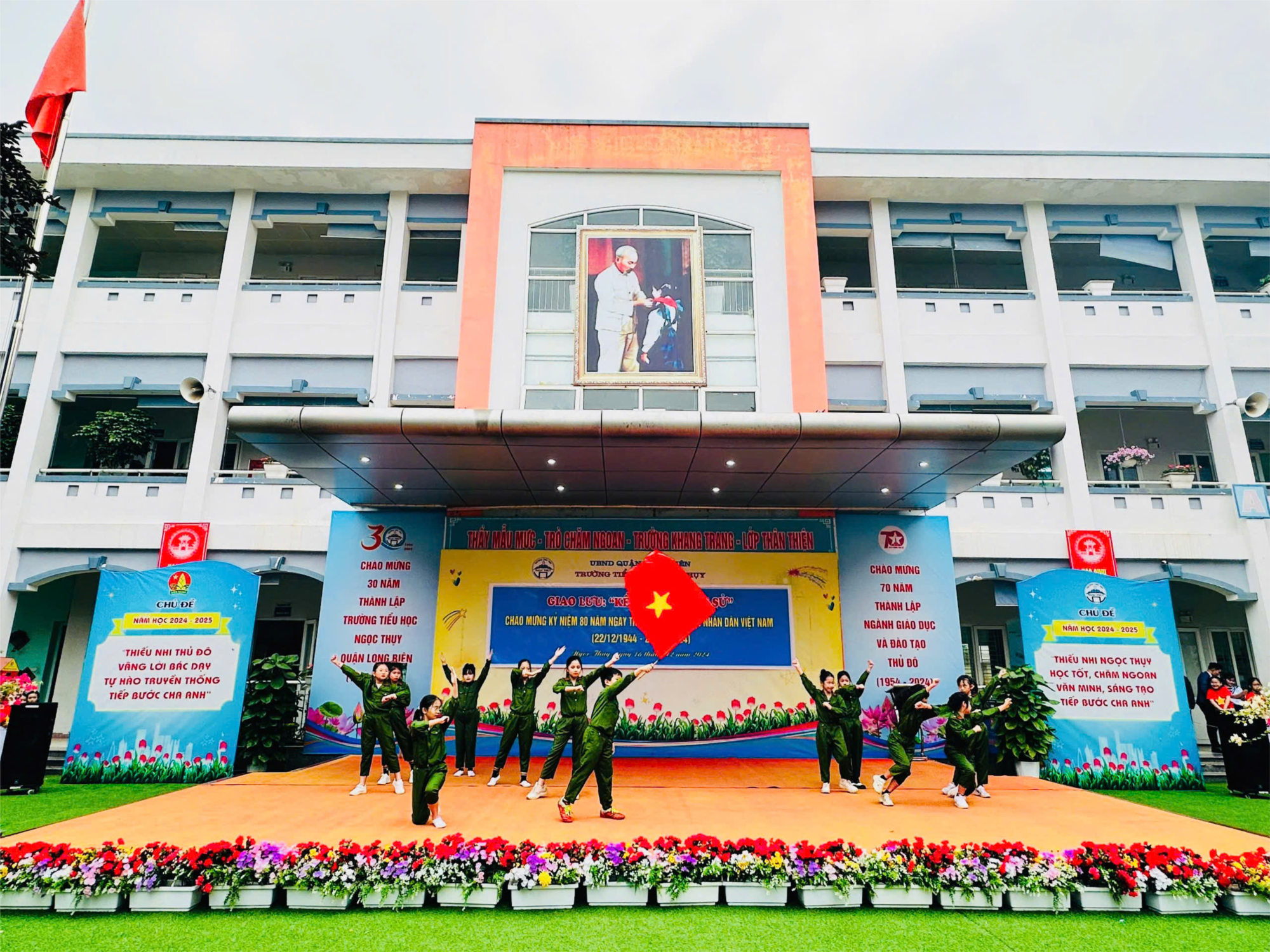 Tiếp đến, Đại tá Nguyễn Đình Hà - Ủy viên Thường vụ Ban chấp hành Hội Cựu Chiến binh phường Ngọc Thụy lên giao lưu với các em HS thông qua các câu chuyện kể về quá trình hình thành, xây dựng và phát triển của Quân đội nhân dân Việt Nam; những câu chuyện kể về các anh hùng dân tộc như: Chủ tịch Hồ Chí Minh, Đại tướng Võ Nguyên Giáp; anh hùng Tô Vĩnh Diện, Phan Đình Giót, Bế Văn Đàn…đến những trận đánh lớn như: Điện Biên Phủ 1954; Điện Biên Phủ trên không 1972 và Cuộc tổng tiến công mùa xuân 1975…