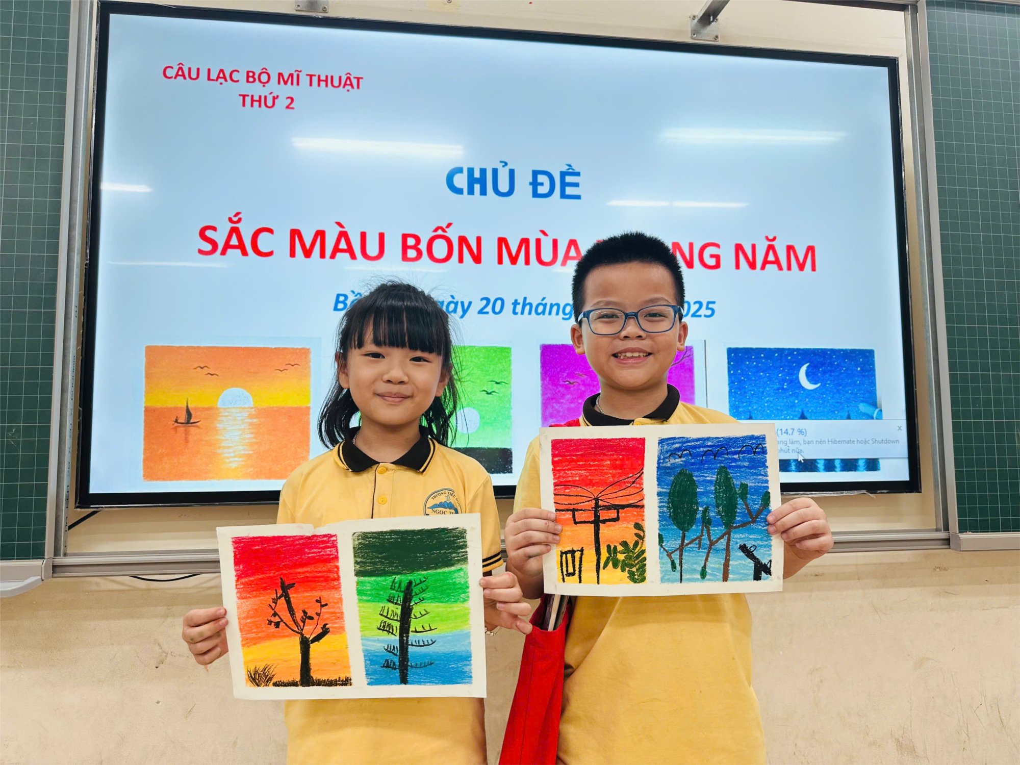 🖌️ Tiếp đến, dưới sự hướng dẫn tận tình của giáo viên phụ trách, các em được tìm hiểu và sáng tác những tác phẩm mĩ thuật giàu tính sáng tạo bằng nhiều chất liệu đa dạng như: màu dầu, màu acrylic, giấy màu, lá cây, hay các vật liệu tái chế…