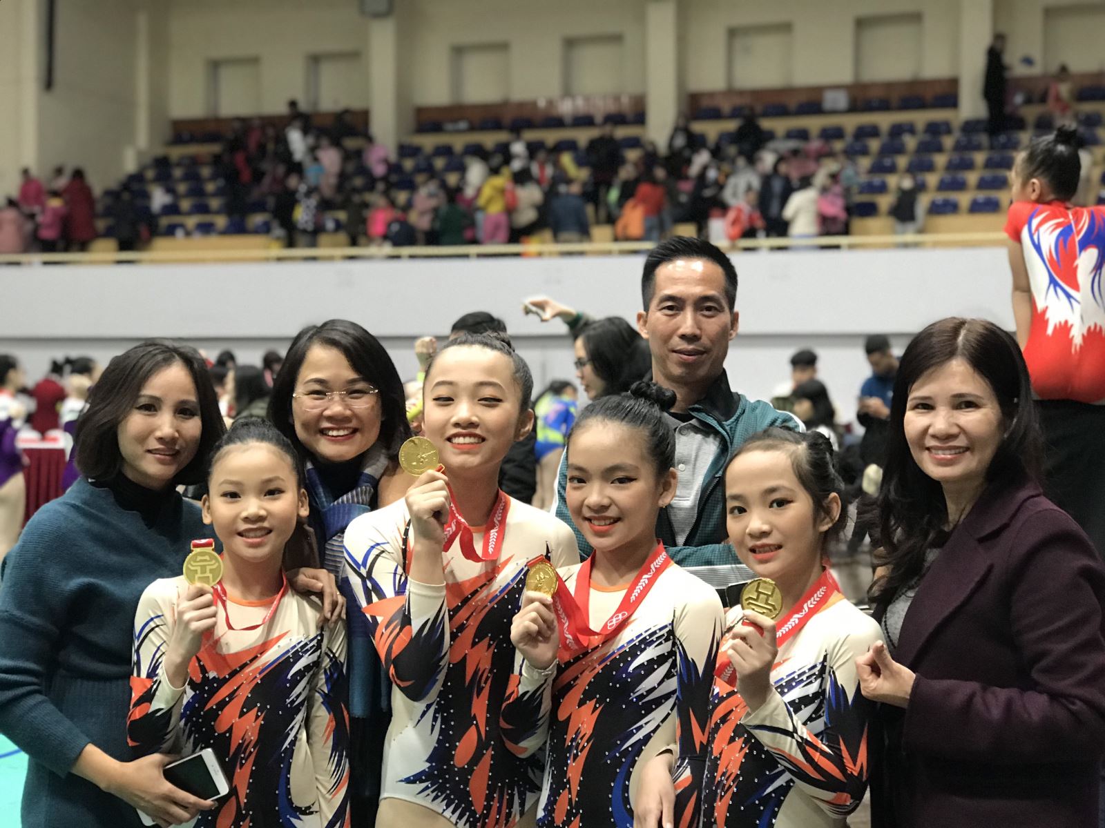 Cô Phạm Thị Xuân ( ngoài cùng bên trái) cùng các em đội Aerobic dành HCV cấp Thành phố