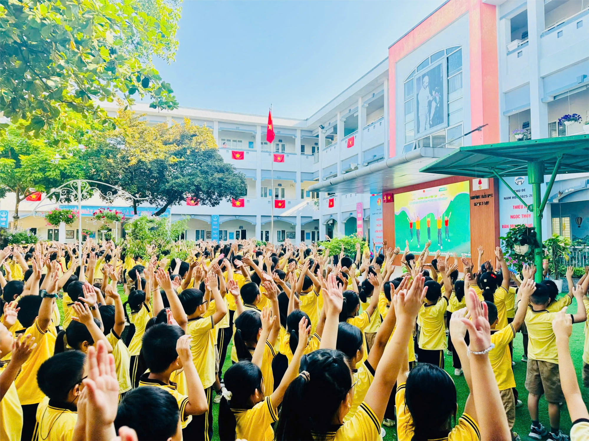 Sáng nay, trong tiết trời thu dịu mát, sân trường Tiểu học Ngọc Thụy rộn ràng tiếng nhạc và tiếng cười. Các em học sinh tham gia bài múa hát tập thể truyền thống “Ngọc Thụy trường em mến yêu” và bài thể dục buổi sáng “Vươn cao Phù Đổng” với tinh thần sôi nổi, hào hứng.