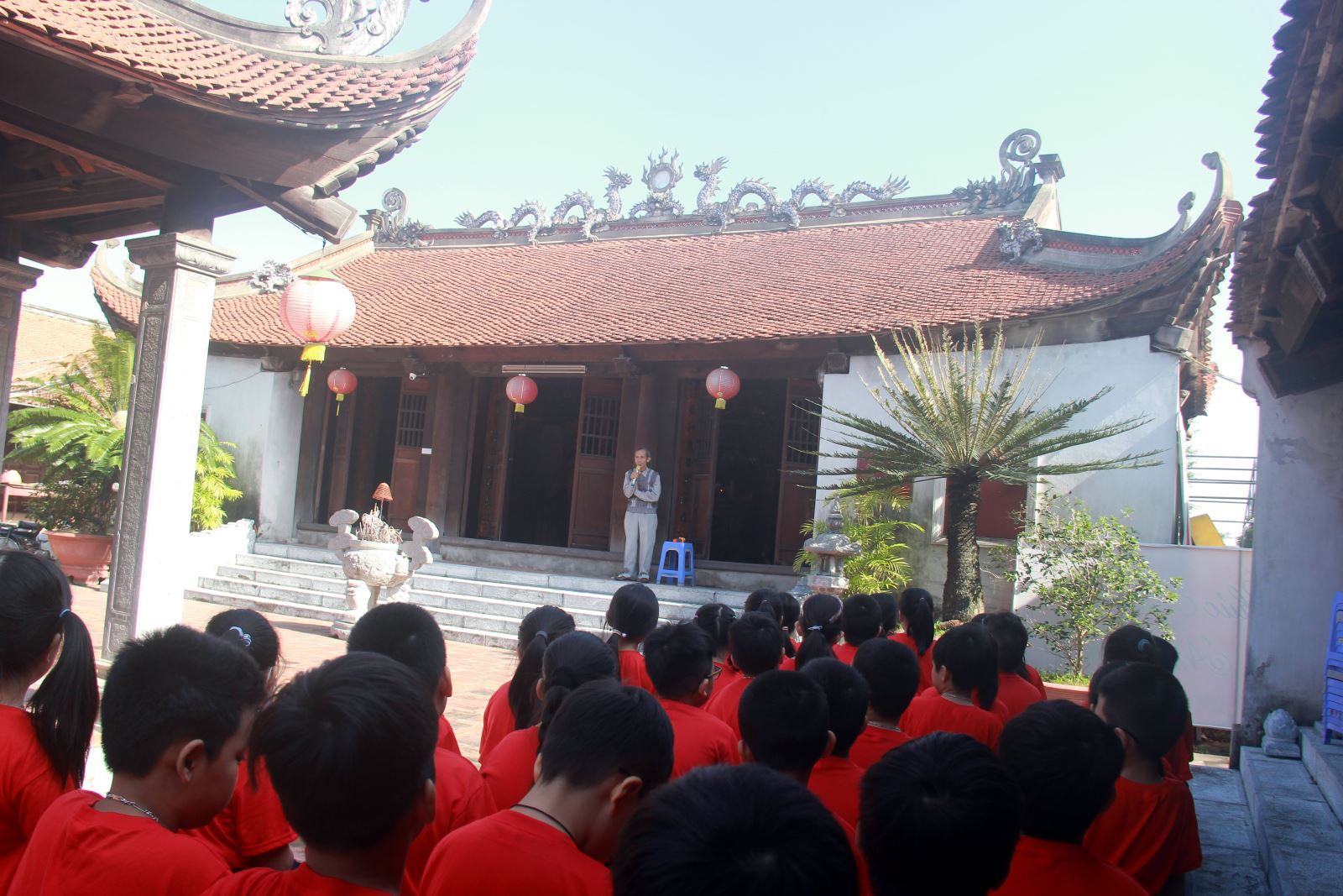 Hình ảnh các em HS ngồi nghe Ban quản lý di tích