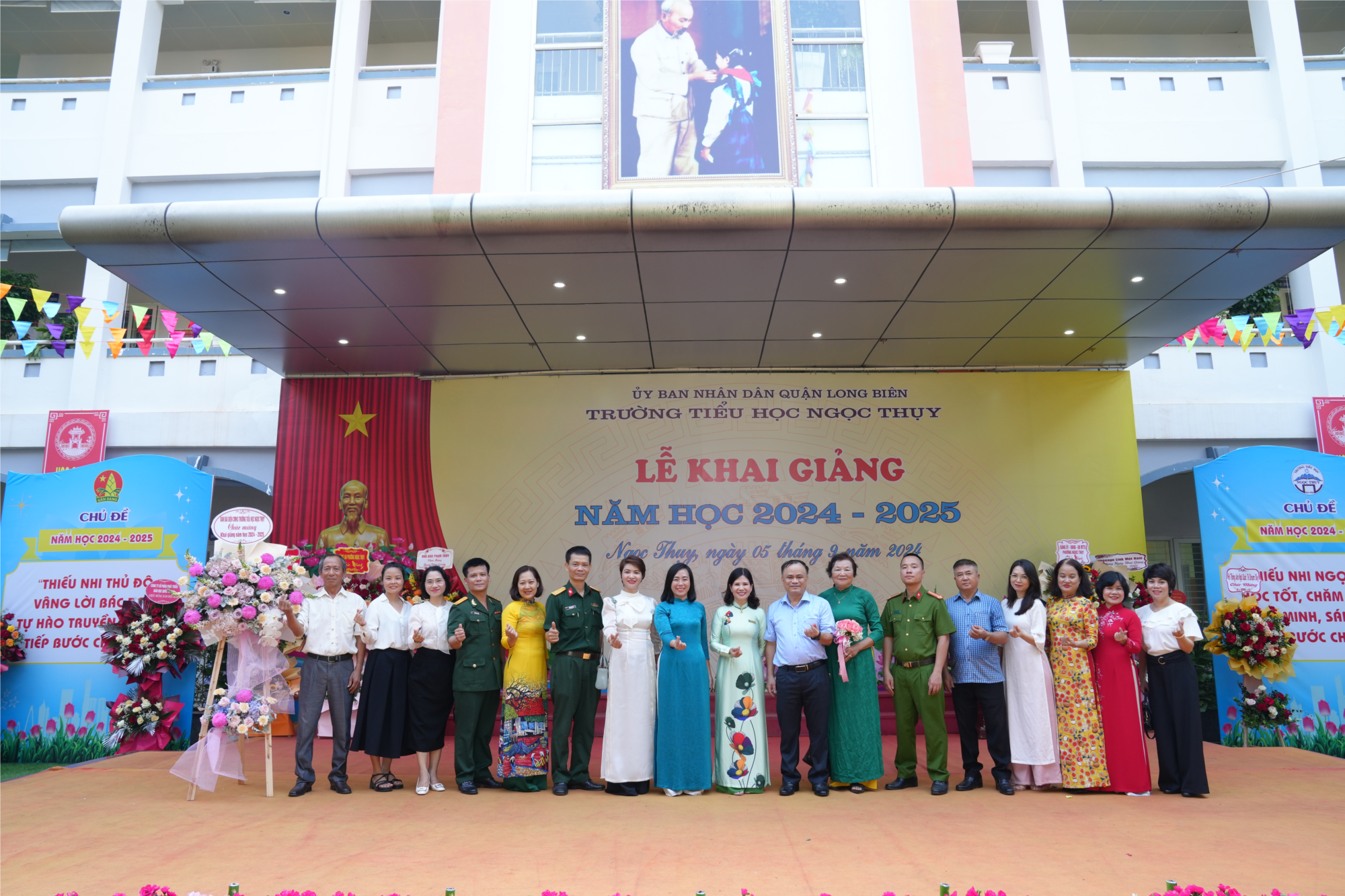 Đến dự buổi lễ khai giảng, nhà trường vinh dự được tiếp đón các quý vị đại biểu, khách quý: Đ/c Lê Quang Thịnh - Ủy viên Thường vụ Đảng ủy – Trưởng Công an phường Ngọc Thụy ; Bà Trương Thị Tuyết – Chủ tịch Hội Cựu giáo chức phường – Nguyên Hiệu trưởng Trường Tiểu học Ngọc Thụy; các ông, bà là đại biểu đại diện các ban, ngành, đoàn thể, các tổ dân phố trên địa bàn phường Ngọc Thụy, các đơn vị liên kết với nhà trường, ban đại diện CMHS trường, ban đại diện CMHS các lớp.