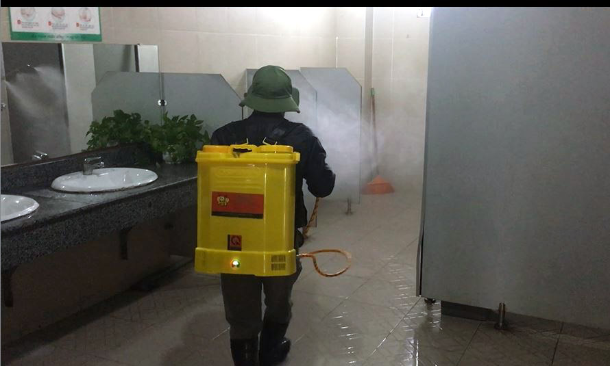 16h15 phút, thứ năm ngày 13/2/2020, nhà trường tiếp tục sử dụng 3 máy phun dung dịch khử khuẩn S&M Chloramin B tại các phòng học, phòng chức năng, hành lang và cầu thang, khu nhà thể chất, khu Hiệu bộ và các khu vực xung quanh trường.