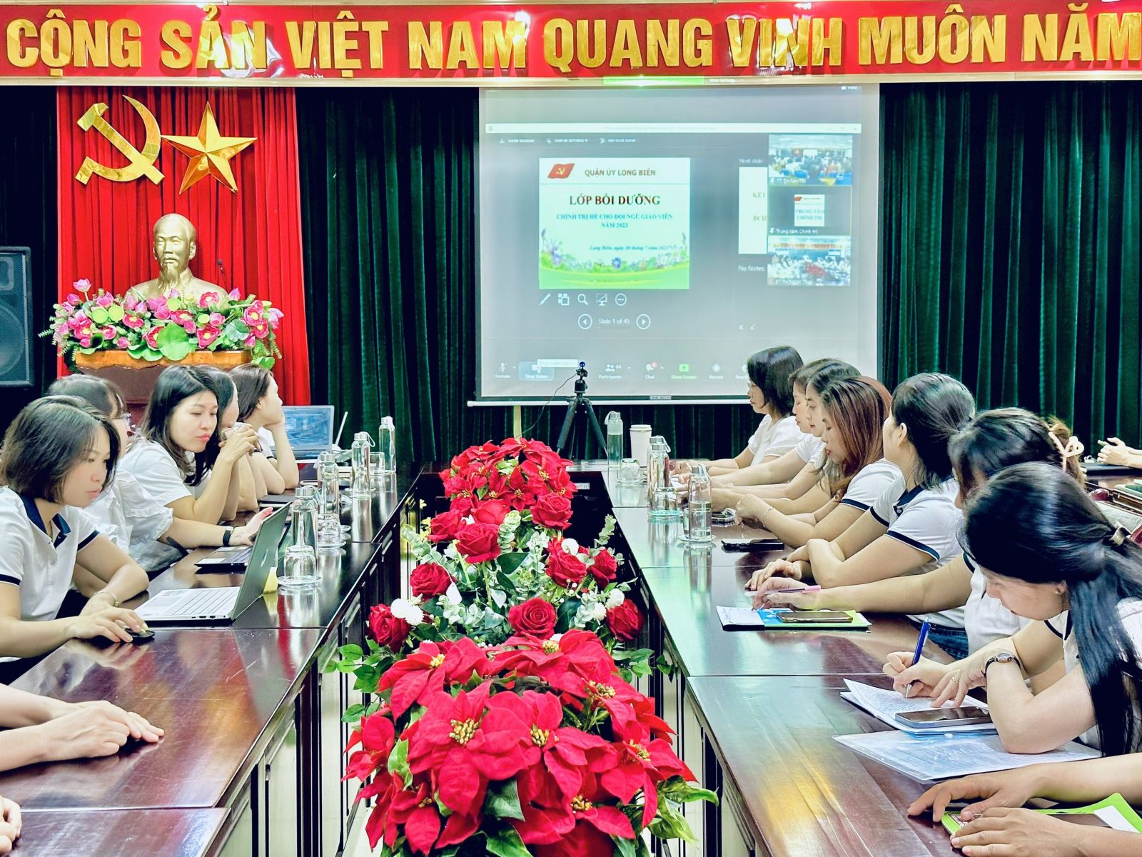 Thực hiện Quyết định số 879/QĐ-QU ngày 13/7/2023 của Quận ủy Long Biên. Sáng ngày 20/7/2023, tập thể CB,GV,NV nhà trường tham dự đầy đủ Lớp Bồi dưỡng chính trị hè cho cán bộ quản lý giáo dục và giáo viên các trường học trên địa bàn quận Long Biên năm 2023.