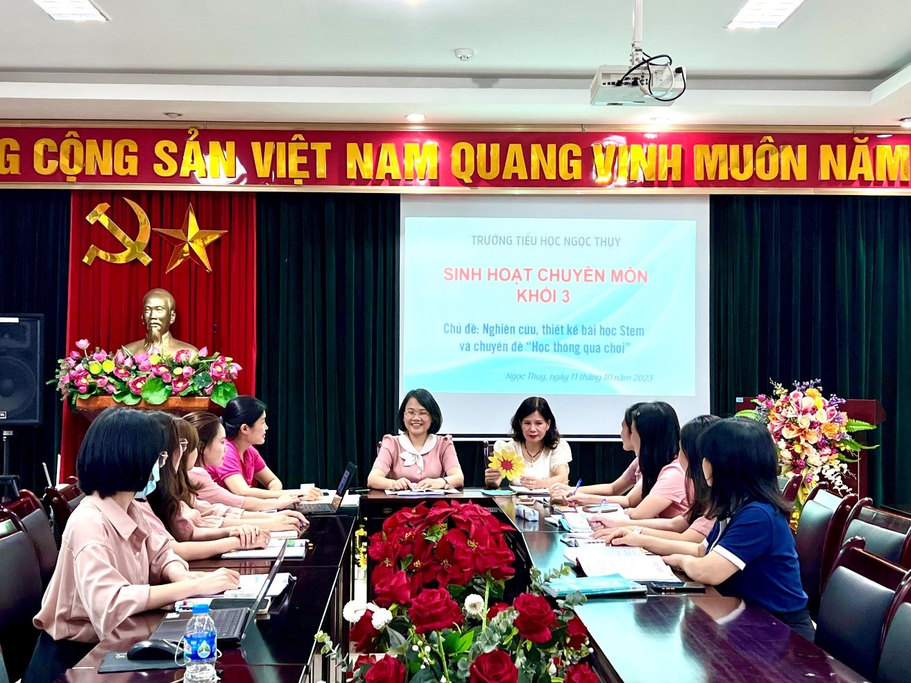 Vào hồi 14h00 ngày 11 tháng 10 năm 2023, tổ 3 trường Tiểu học Ngọc Thụy đã tổ chức buổi sinh hoạt chuyên môn với nội dung: “Nghiên cứu, thiết kế bài học Stem” và chuyên đề: “Học thông qua chơi”. Tổ 3 là tổ có nhiều giáo viên trẻ, năng động, sáng tạo, giỏi công nghệ thông tin, có tinh thần học hỏi. Vì vậy trong mỗi buổi sinh hoạt, các giáo viên đều chủ động trau dồi chuyên môn nghiệp vụ, đóng góp ý kiến, nêu thắc mắc để cả tổ cùng giải đáp.