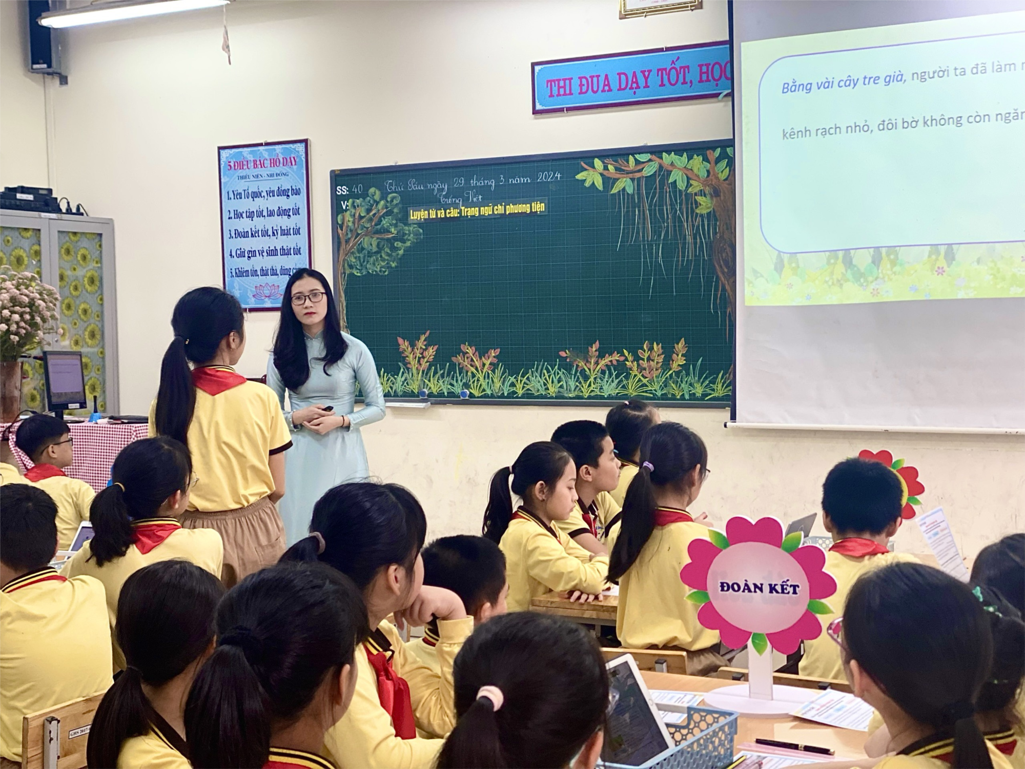 Xuyên suốt trong tiết dạy của mình, cô Hân đã xây dựng được bài giảng với nội dung hết sức phong phú, tổ chức các hoạt động đa dạng, phát huy được tính chủ động tích cực của học sinh. Cô giáo sử dụng thành thạo phương tiện dạy học hiện đại như: dạy học bằng bài tương tác thông minh trên máy tính bảng, sử dụng phiếu học tập, xây dựng nhân vật Trạng Tí phù hợp với nội dung xuyên suốt bài học khiến cho các đơn vị kiến thức từ và câu trừu tượng, khó nhớ trở nên sinh động hấp dẫn và lôi cuốn hơn. Bài giảng của cô đã giúp học sinh nắm vững được kiến thức, các con học sinh tích cực, sôi nổi hợp tác với cô Hân trong tiết dạy.