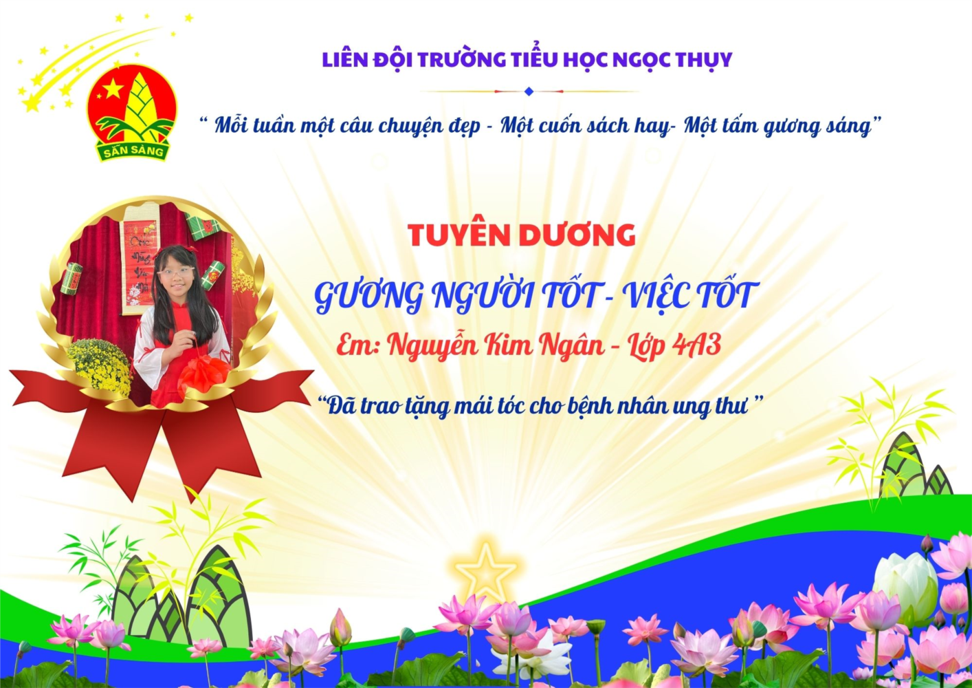 Nguyễn Kim Ngân – học sinh lớp 4A3, Trường Tiểu học Ngọc Thụy (năm học 2025–2026) – là một cán bộ lớp gương mẫu, chăm chỉ và đầy trách nhiệm. Cô bé đã ấp ủ mong muốn nuôi dưỡng mái tóc dài của mình để hiến tặng cho các bệnh nhân ung thư – một hành động nhỏ nhưng chứa đựng tình yêu thương lớn.