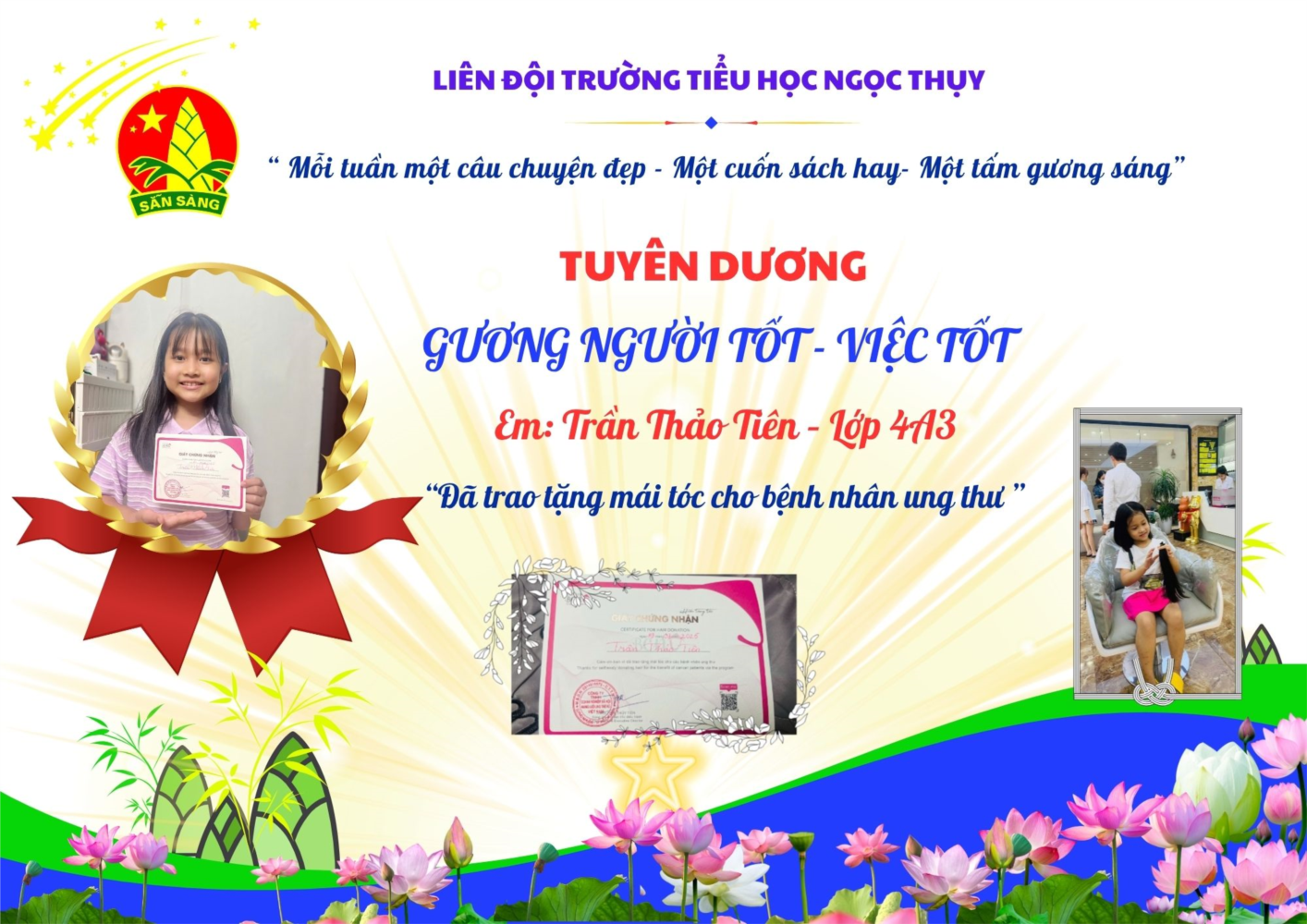 Không chỉ vậy, Thảo Tiên còn là một học sinh ngoan, chăm chỉ, luôn nỗ lực vươn lên trong học tập. Những việc làm giản dị nhưng ý nghĩa của em chính là những hạt mầm tốt đẹp, góp phần lan tỏa yêu thương trong cộng đồng.