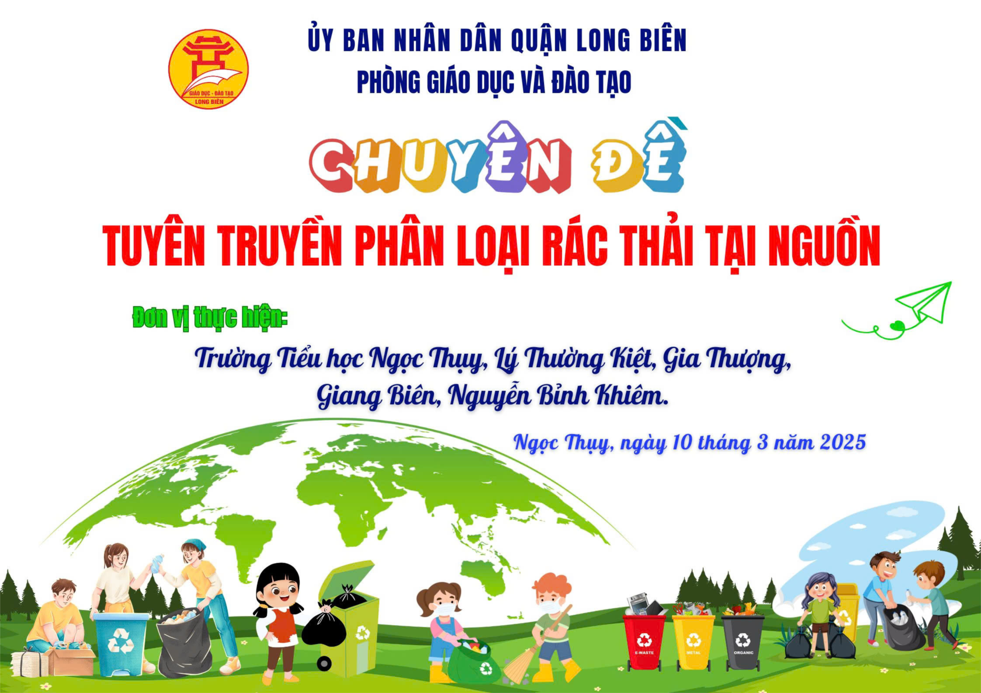 Sáng ngày 10/3/2025, trường TH Ngọc Thụy đã cùng với các nhà trường: TH Gia thượng, TH Giang Biên, TH Lý Thường Kiệt, TH Nguyễn Bỉnh Khiêm đã tổ chức thành công chuyên đề cấp quận với chủ đề “Tuyên truyền phân loại rác thải tại nguồn”. Chuyên đề được thực hiện trực tiếp tại Hội trường UBND phường Ngọc Thụy và được phát trực tuyến trên fanpage Ngành GD&ĐT quận Long Biên và trên trang Youtube.