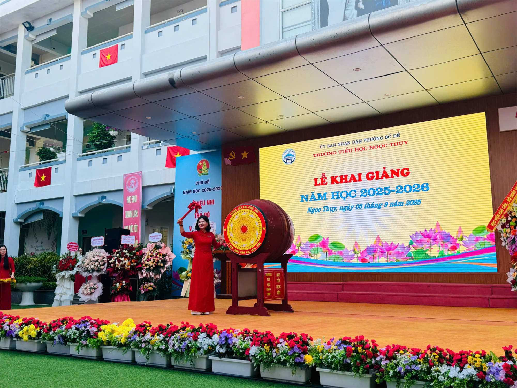 Thay mặt Ban giám hiệu nhà trường, Nhà giáo ưu tú Nguyễn Thị Phương – Bí thư Chi bộ, Hiệu trưởng đọc diễn văn Khai giảng và đánh trống khai trường năm học 2025-2026.
